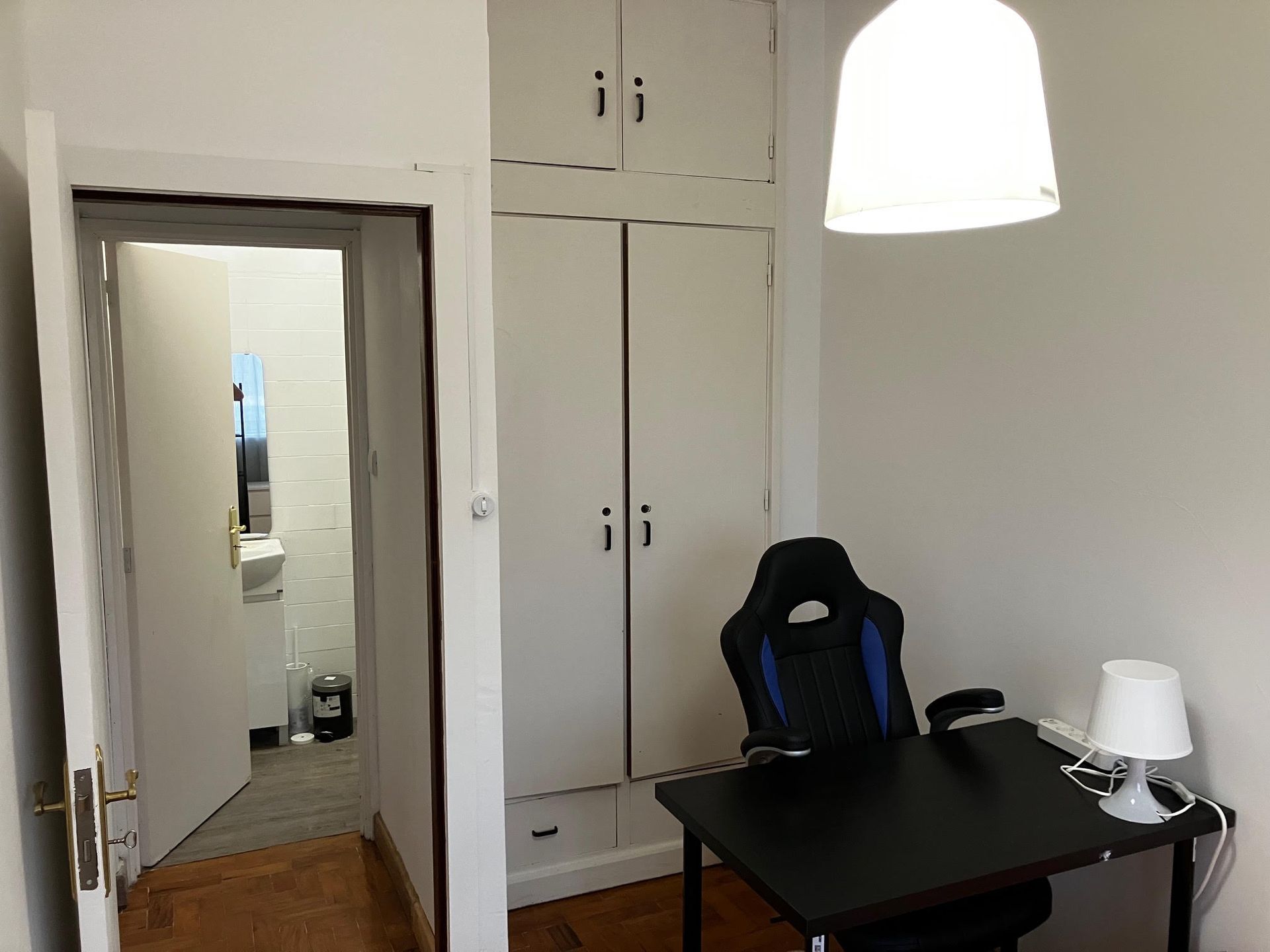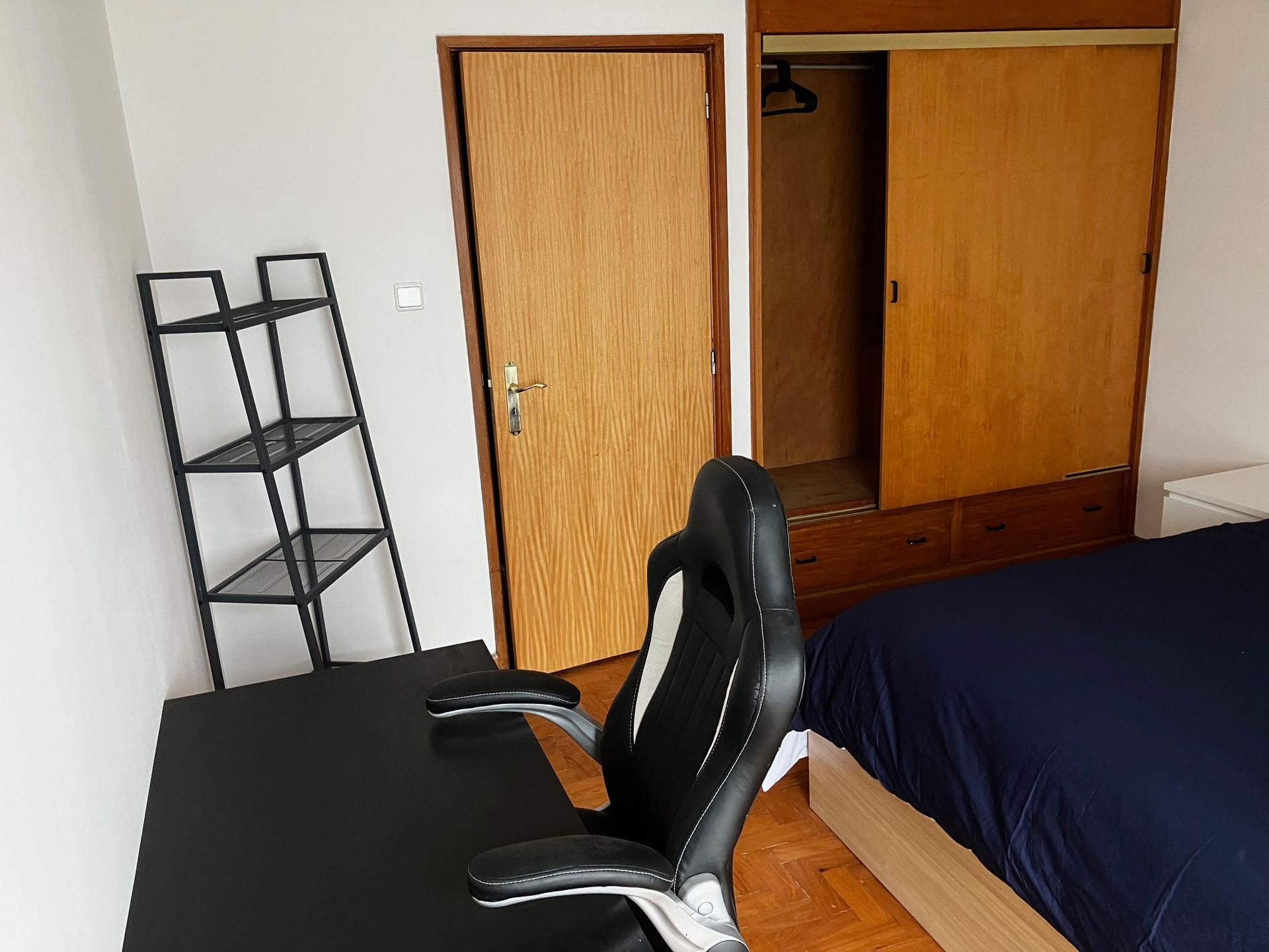 Spacious interior room with a single bed, ample shelf space, a closet, and a desk with chair.